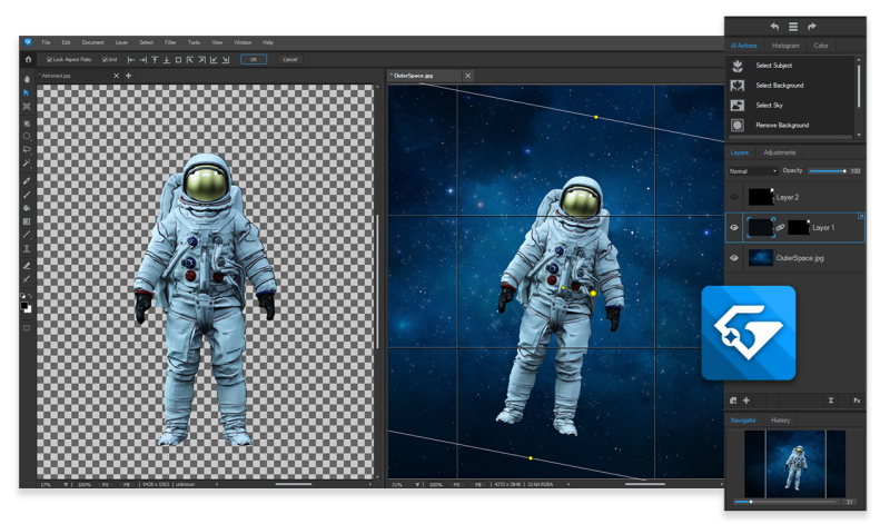 Con una interfaz única de múltiples documentos (MDI), este editor es ideal para flujos de trabajo complejos de procesamiento de imágenes. Utilice herramientas basadas en IA para manipular imágenes en capas, refinar archivos RAW de forma no destructiva y experimentar con composiciones, todo dentro de un diseño flexible en pestañas que aumenta la productividad.