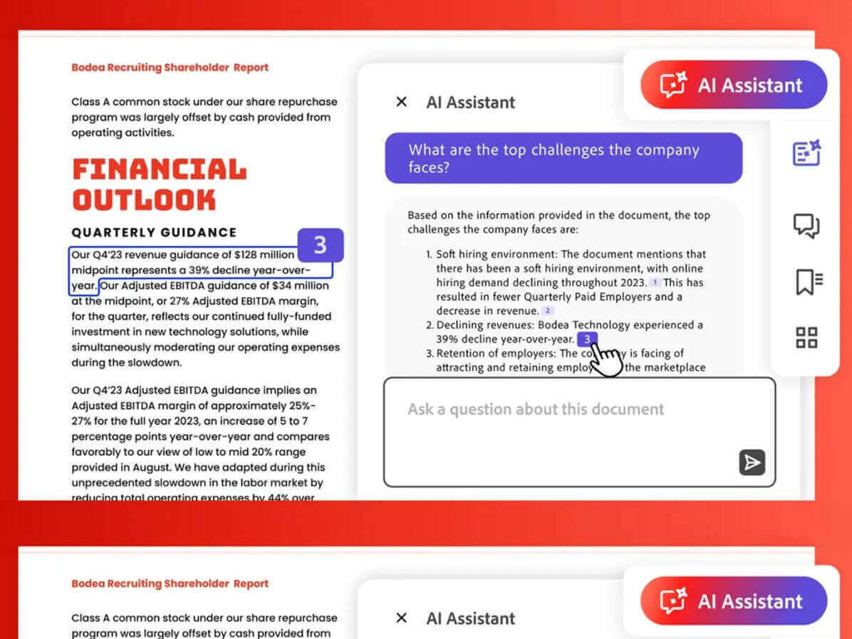 Simplifique las tareas documentales con Adobe Acrobat: edite, comparta y solicite firmas electrónicas con facilidad. Aproveche el asistente AI integrado para formular preguntas o generar resúmenes instantáneos de documentos, ayudando a su equipo a mantenerse productivo y enfocado.
